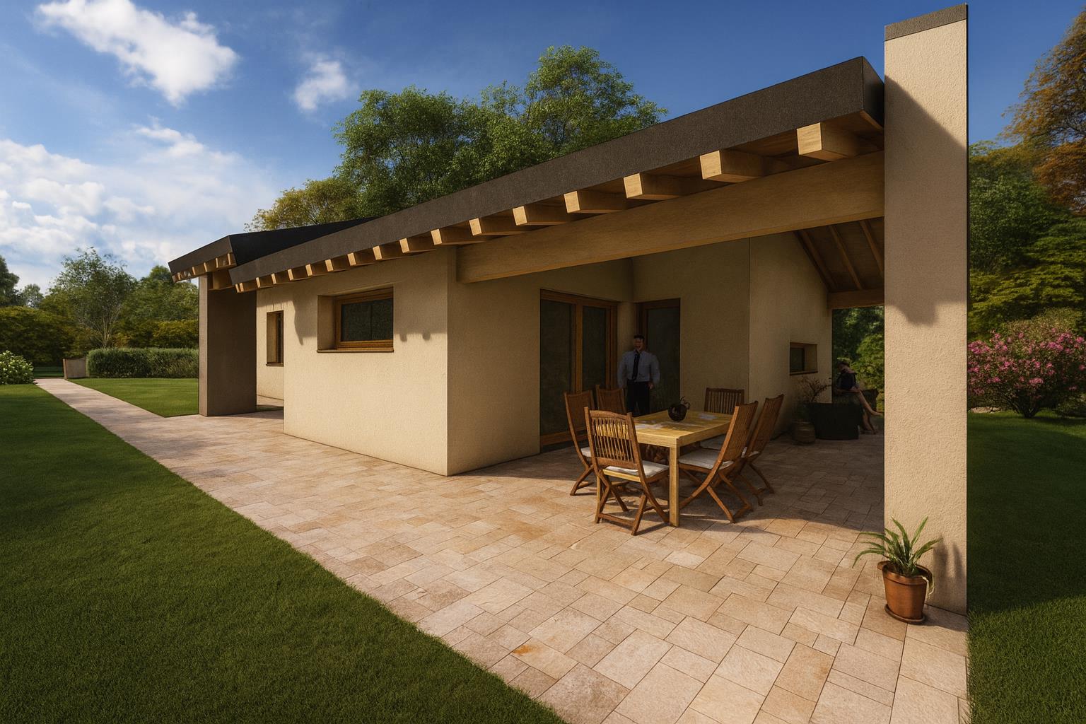 Le linee pulite e il tetto a falde asimmetriche donano eleganza e leggerezza all’insieme.