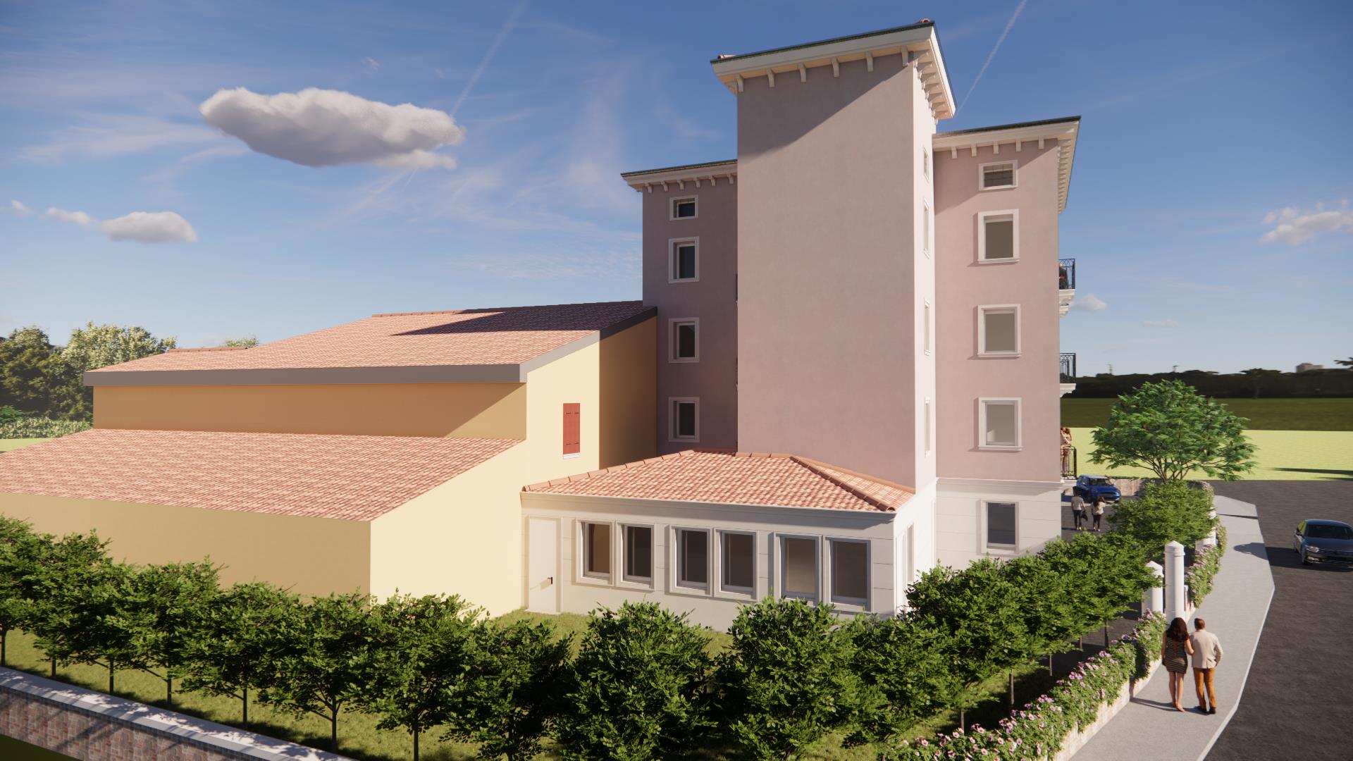 Il progetto ha previsto da un lato la realizzazione di un ampliamento delle cucine sul retro, finalizzato a migliorarne la funzionalità e a rispondere alle nuove esigenze gestionali, e dall’altro la completa ristrutturazione della parte alberghiera, con l’obiettivo di restituire spazi pienamente fruibili e valorizzare l’intero complesso.
